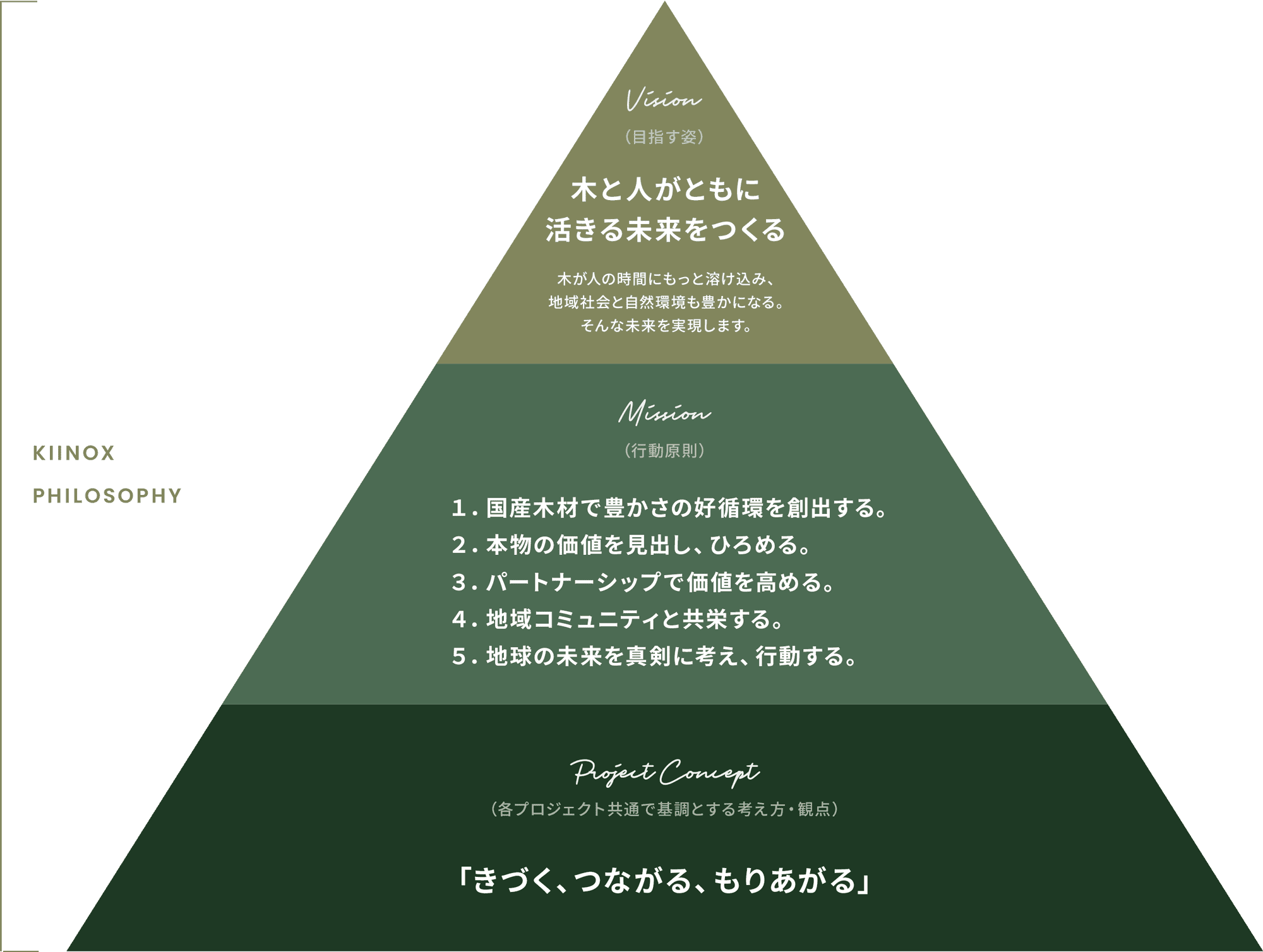 キイノクス プロジェクトは、国産木材の利活用および流通に関わる多くの方々とともに、革新的な取り組みを行うことにより、「木」がより身近に、そして素敵に存在するという世界観を実現し、豊かな未来を創造します。