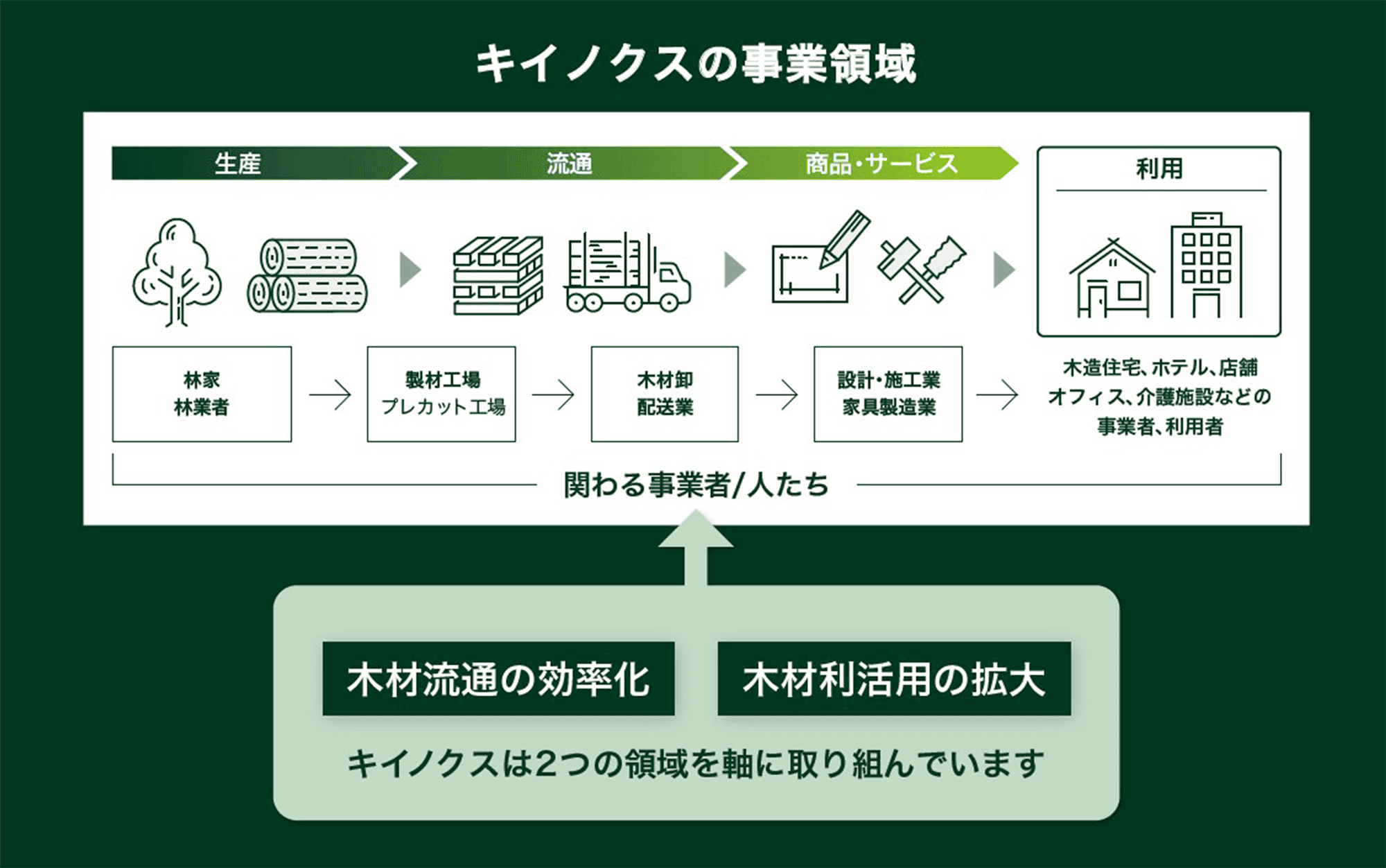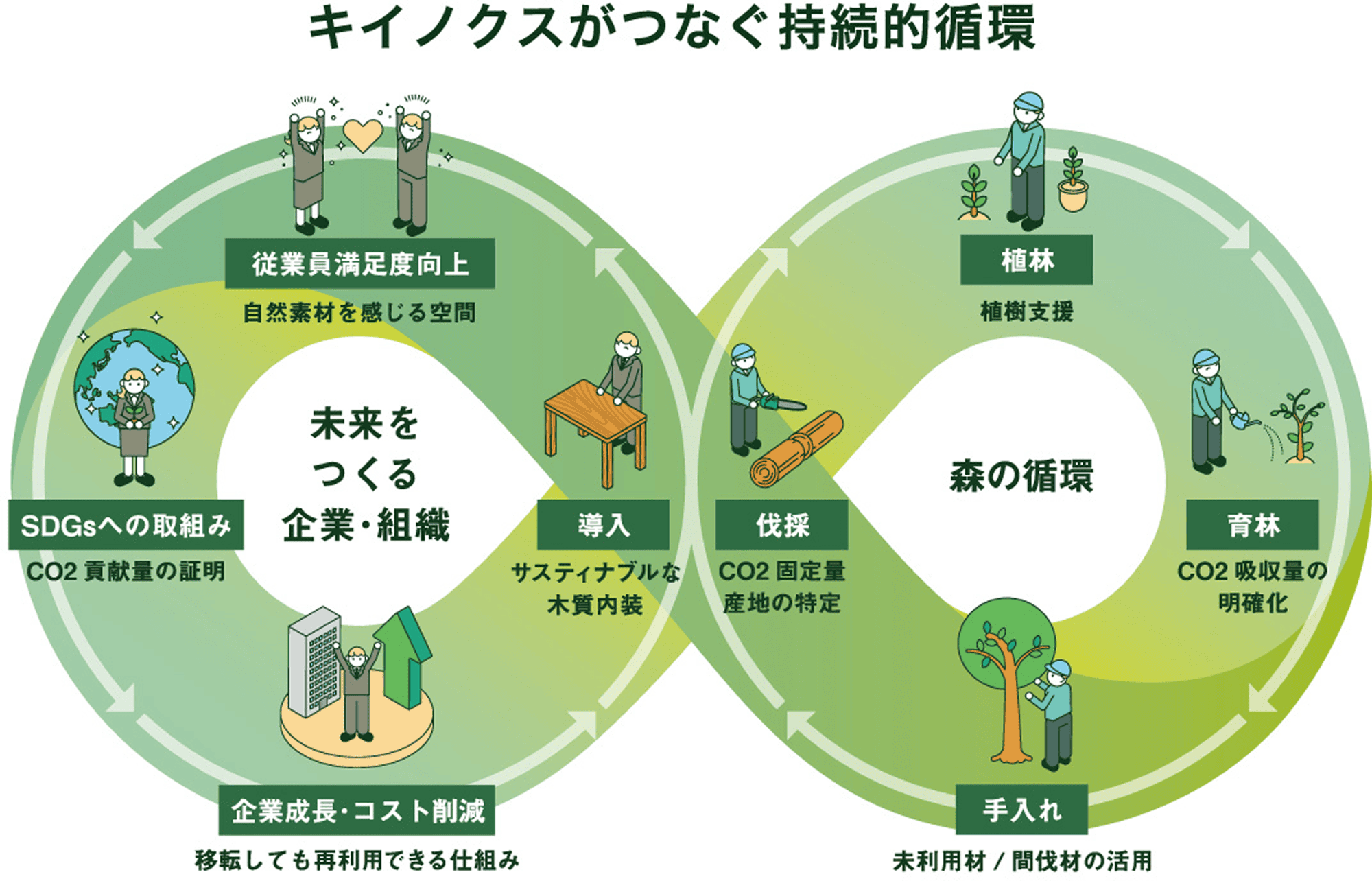 キイノクスは、国産木材の利活用および流通を促進させる事業活動を通して、森林を始めとした自然環境・地球環境の保全、地域経済の活性化、我々の心身の健康といった社会的課題を解決することを目指すプロジェクトを象徴するブランドです。