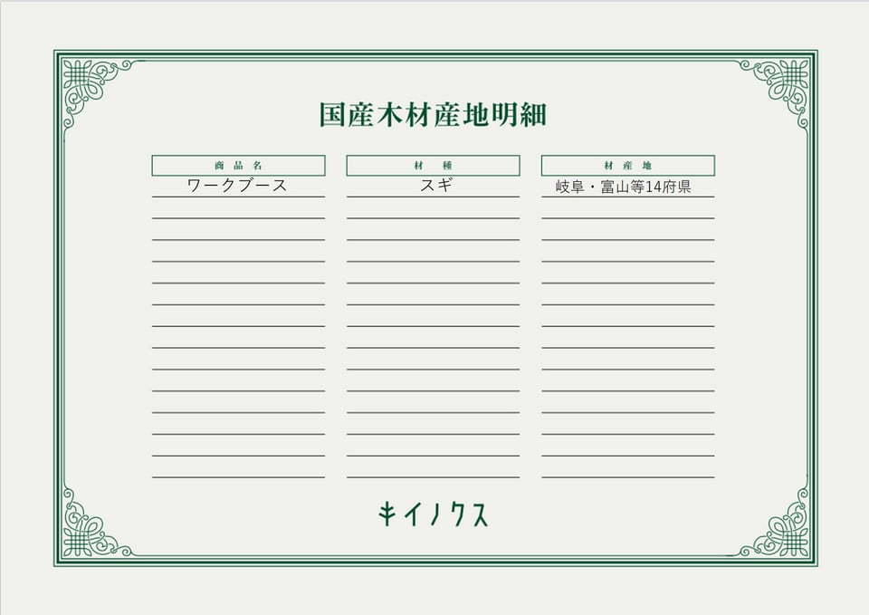 キイノクスでは、国産木材ご提供量に応じた植樹をお付けしています。また、カーボンニュートラル貢献量証明書を発行してお渡します。